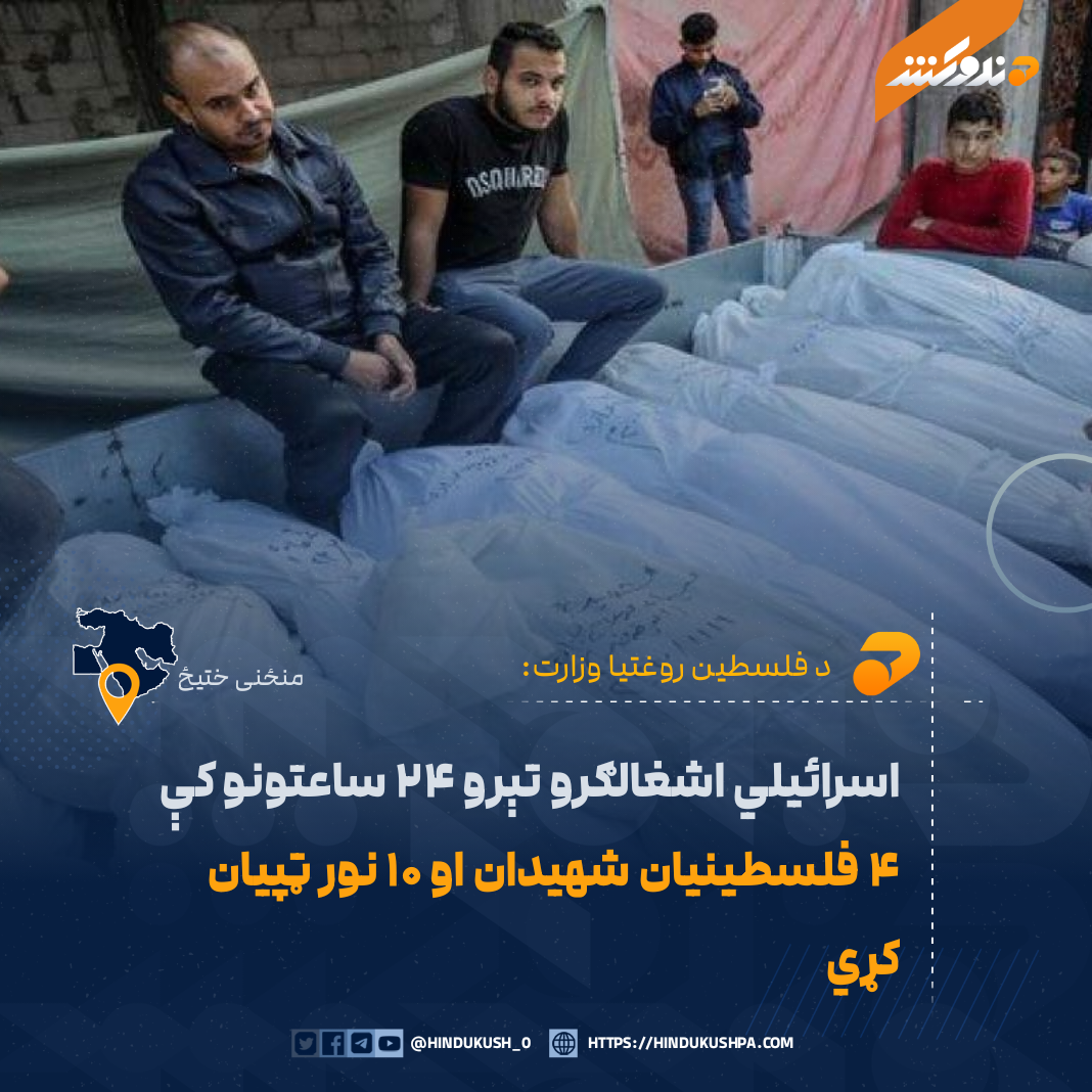 د فلسطین روغتیا وزارت ویلي، چې تېرو ۲۴ ساعتونو کې د اسرائیلي ځواکونو بریدونو له امله ۴ فلسطینیان شهیدان او ۱۰ نور ټپیان شوي.