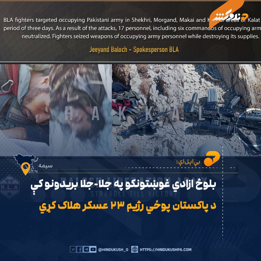د بلوچستان د ازادۍ غورځنګ (بياېلاې) ویلي، چې جنګیالیو یې په څلور جلا-جلا بریدونو کې د پاکستان پوځي رژیم ۲۳ عسکر هلاک کړي دي.