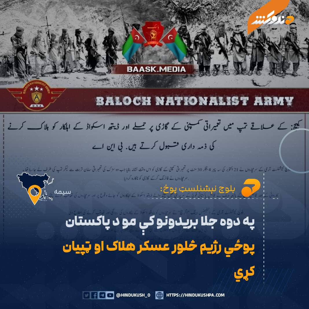 د بلوچستان نېشنلسټ پوځ (BNA) د یوې خبرپاڼې په خپرولو سره ویلي، چې وسله والو یې په دوه جلا بریدونو کې د پاکستان پوځي رژیم دوه عسکر هلاک او دوه نور ټپیان کړي دي.