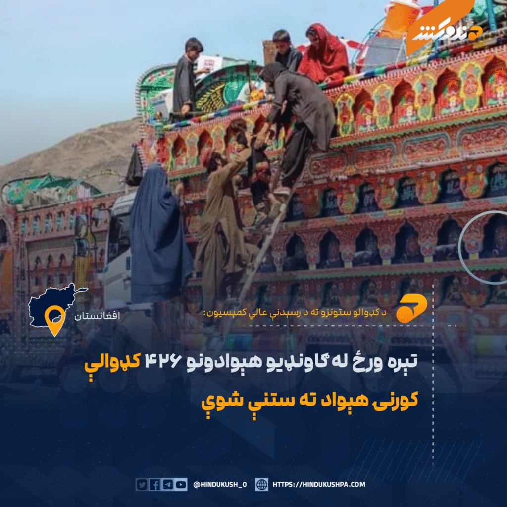 د کډوالو ستونزو ته د رسېدنې عالي کمېسیون ویلي، تېره ورځ (سه شنبه) ۴۲۶ کډوالې کورنۍ چې د غړو شمېر یې دوه زره او ۴۶۶ تنه کېږي د سپین بولدک، تورخم، بهرامچې، ورېښمو پل او اسلامکلا له لارو هېواد ته راستنې شوې دي.