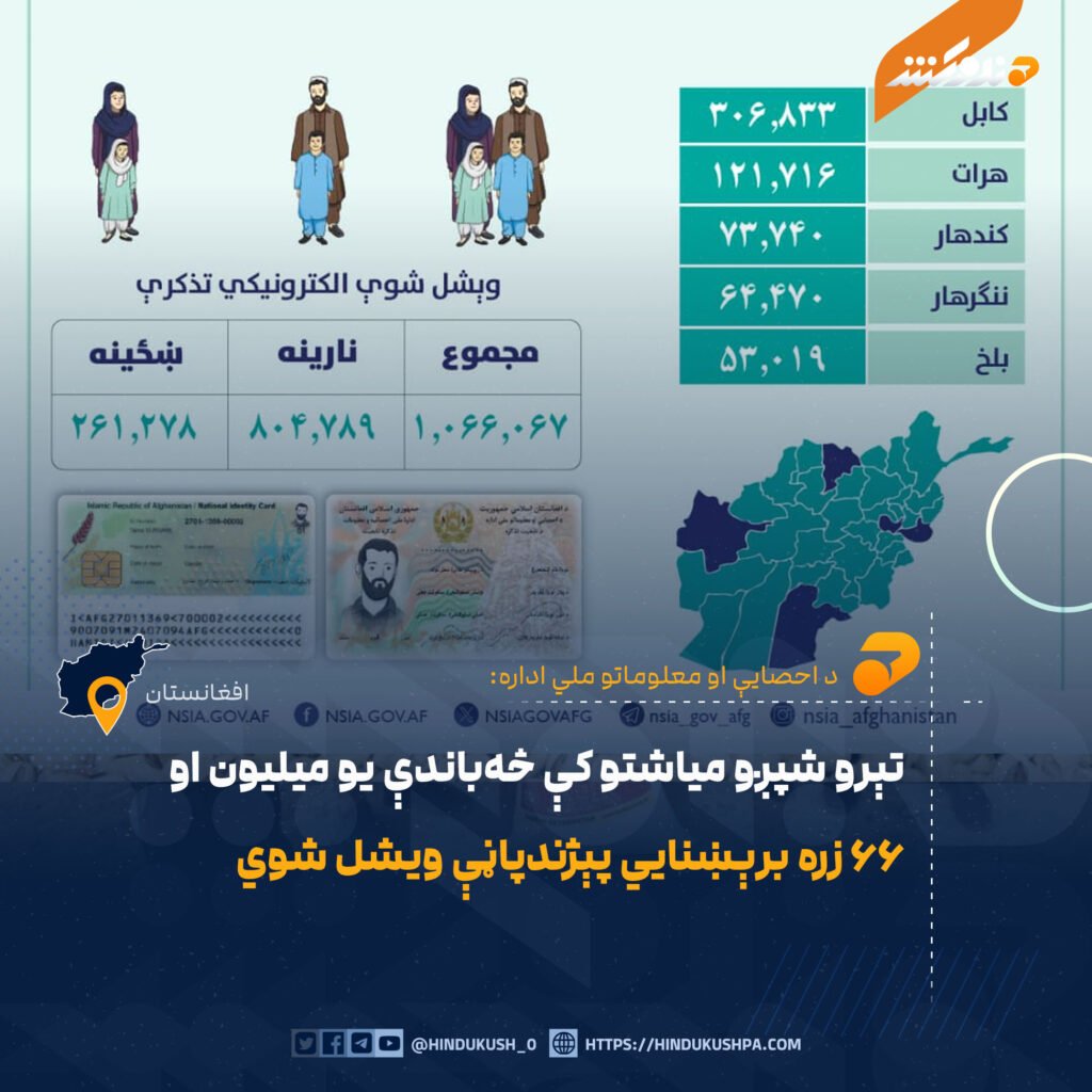د احصایې او معلوماتو ملي اداره زیاتوي، چې د برېښنایي پېژندپاڼو د وېش له پیل راهیسې تر اوسه ۱۶ میلیونه او ۵۶۱ زره هېوادوالو ته تذکرې ویشل شوې دي.