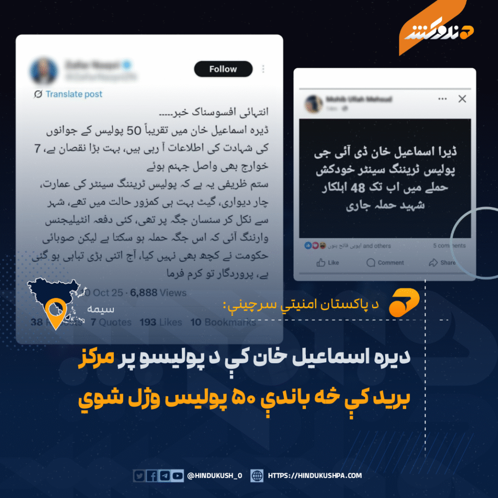 د پاکستان امنیتي سرچینو ویلي، چې د خیبر پښتونخوا دېره اسماعیل خان ولسوالۍ کې د پولیسو پر روزنیز مرکز د نن شپې ډلهییز برید کې تر ۵۰ ډېر پولیس وژل شوي دي.