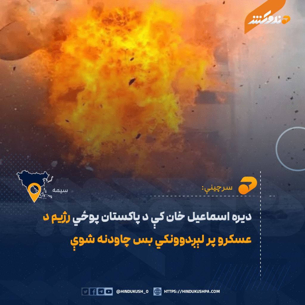 د پاکستان پوځي رژیم امنیتي ادارو منلې، چې نن (سه‌شنبه) سهار د دېره اسماعیل خان ولسوالۍ په درابن سیمه کې د یاد رژیم د عسکرو پر لېږدوونکي بس بمي برید شوی.