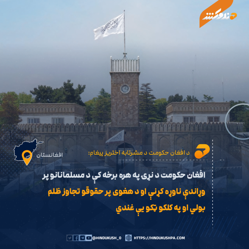 د افغان حکومت د مشرتابه اختریز پیغام: افغان حکومت د نړۍ په هره برخه کې د مسلمانانو پر وړاندې ناوړه کړنې او د هغوی پر حقوقو تجاوز ظلم بولي او په کلکو ټکو یې غندي