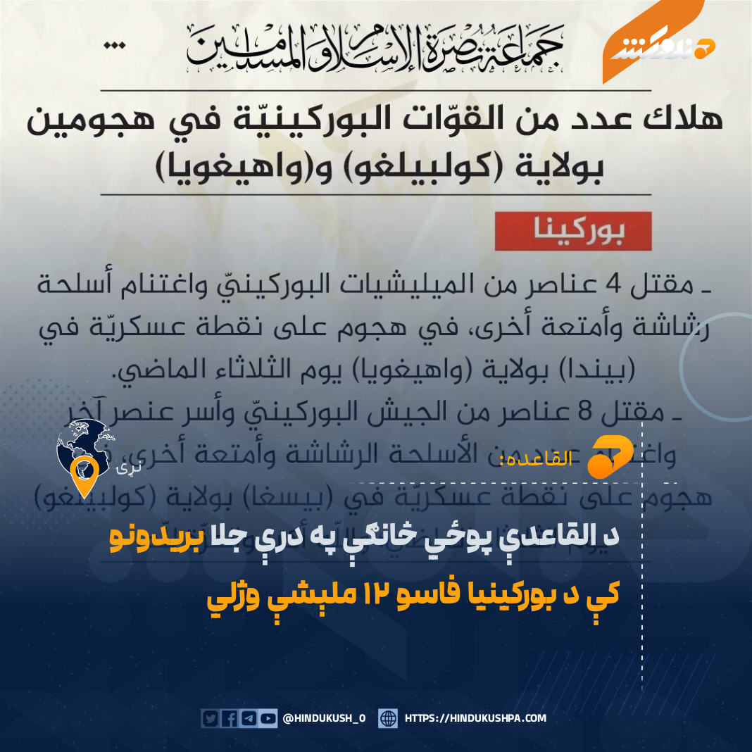 د القاعدې غورځنګ پوځي څانګې «جماعة نصرة الاسلام والمسلمین» بورکینیا فاسو کې پر پوځ او ملېشو درې بریدونه ترسره کړي، چې په ترڅ کې یې ۱۲ تنه وژل شوي دي.