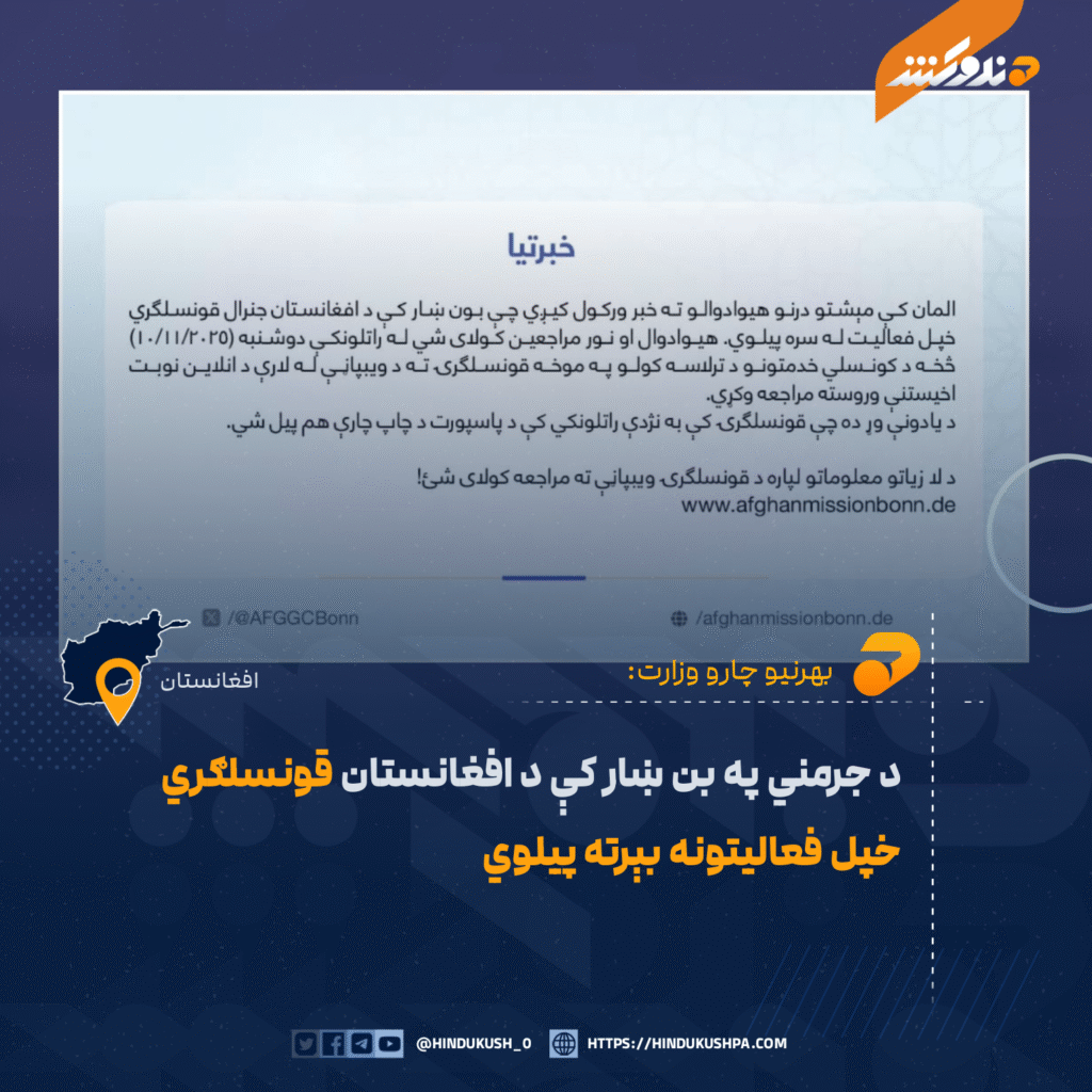 بن کې د افغانستان جنرل قونسلګرۍ پر خپله اېکس پاڼه د یوې خبرتیا په خپرولو سره ویلي، چې هېوادوال کولای شي له راتلونکې دوشنبې ورځې څخه د قونسلي خدماتو د ترلاسه کولو په موخه دغې قونسلګرۍ ته مراجعه وکړي.