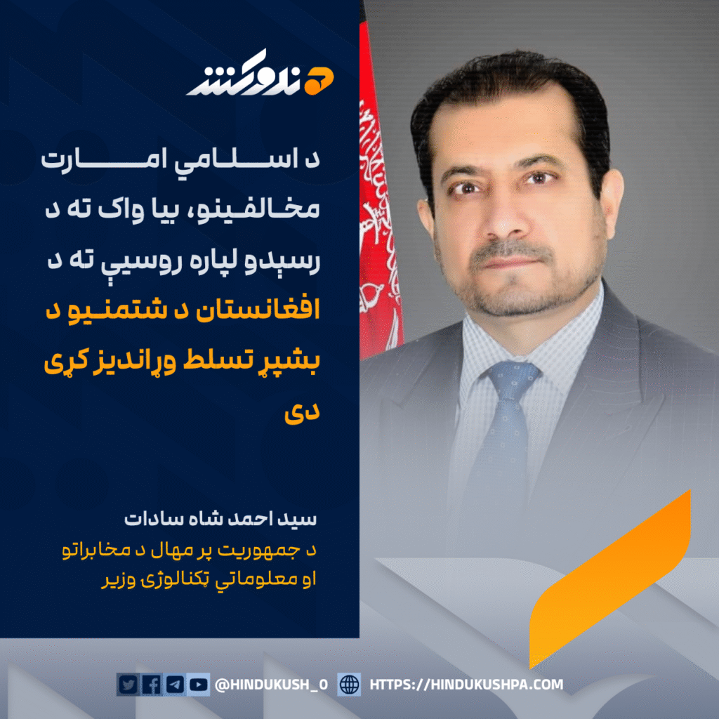 د جمهوريت پر مهال د مخابراتو او معلوماتي ټکنالوژۍ وزير سيد احمد شاه‌ سادات: د اسلامي امارت مخالفينو، بيا واک ته د رسېدو لپاره روسیې ته د افغانستان د شتمنيو د بشپړ تسلط وړانديز کړی دی