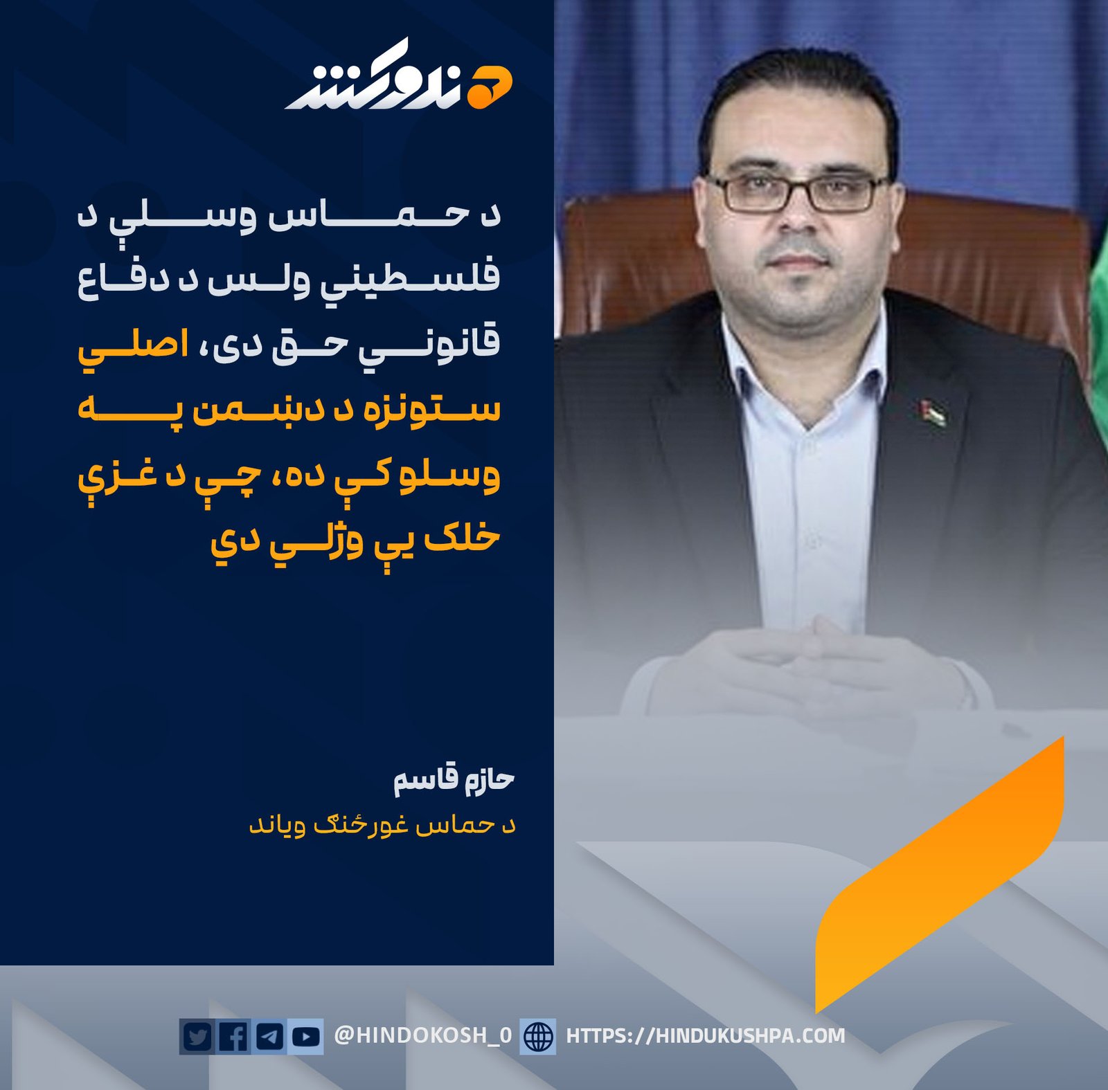 د حماس غورځنګ وياند حازم قاسم: د حماس وسلې د فلسطيني ولس د دفاع قانوني حق دی، اصلي ستونزه د دښمن په وسلو کې ده، چې د غزې خلک یې وژلي دي