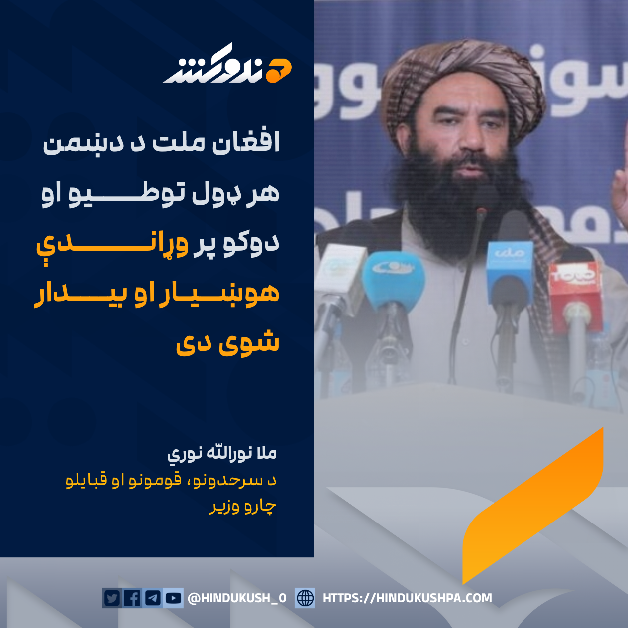 تاسو په:کورپاڼه»افغانستان»‏د سرحدونو، قومونو او قبایلو چارو وزیر، ملا نورالله نوري: افغان ملت د دښمن هر ډول توطیو او دوکو پر وړاندې هوښیار او بیدار شوی دی