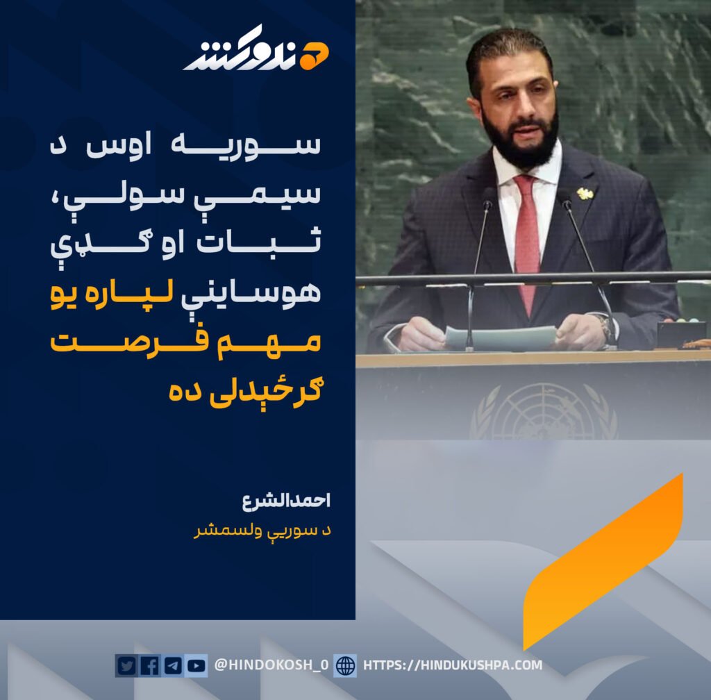 د سوریې ولسمشر احمد الشرع د ملګرو ملتونو عمومي اسمبلۍ ته په وینا کې ټینګار کړی، چې سوریه اوس د سیمې سولې، ثبات او ګډې هوساینې لپاره یو مهم فرصت ګرځېدلی ده.