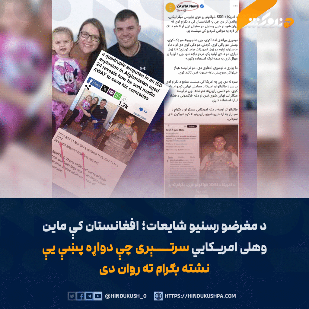 له نن سهار راهیسې د زاويه نيوز په ګډون يو شمېر مغرضو فسبوک اکاونټ چلوونکو چې ځان ته د رسنۍ خطاب کوي د «Travi Mills» په نوم د يوه امريکايي سرتېري د انځور په خپرولو سره غوغا جوړه کړې، چې ګواکې امريکايي سرتېري بګرام ته پر لاره دي.