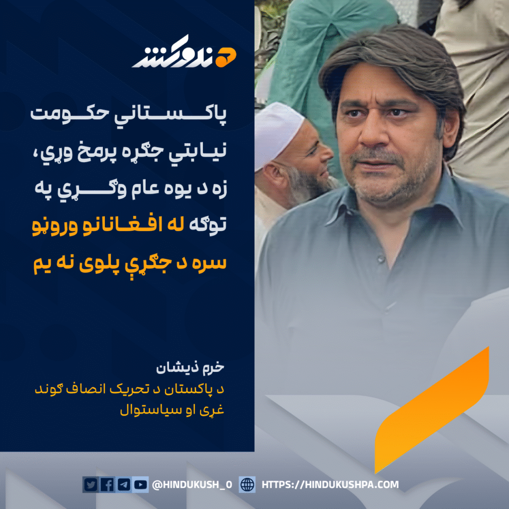 د پاکستان د تحريک انصاف ګوند مخکښ غړي او سياستوال خرم ذيشان ويلي، چې پاکستاني حکومت د افغانستان پر وړاندې نيابتي جګړه پرمخ وړي او په خبره یې دی د پاکستان د يوه عادي وګړي په توګه افغانانو سره د جګړې پلوی نه دی.