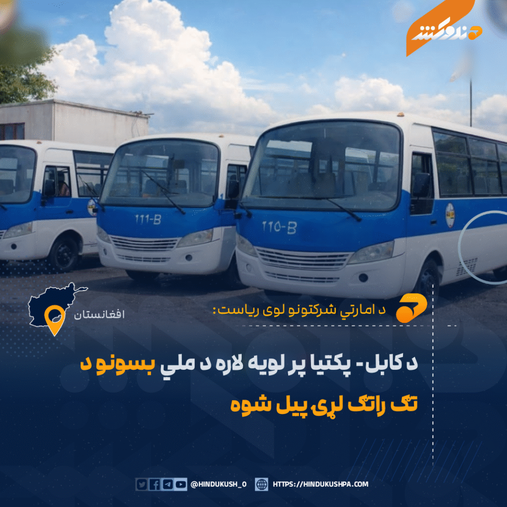 د امارتي شرکتونو لوی ریاست وایي، د ملي بس امارتي شرکت تېره ورځ (د وري، دویمه) د کابل ـ پکتیا پر لویه لاره د ملي بسونو د تګ راتګ بهیر پیل کړ.