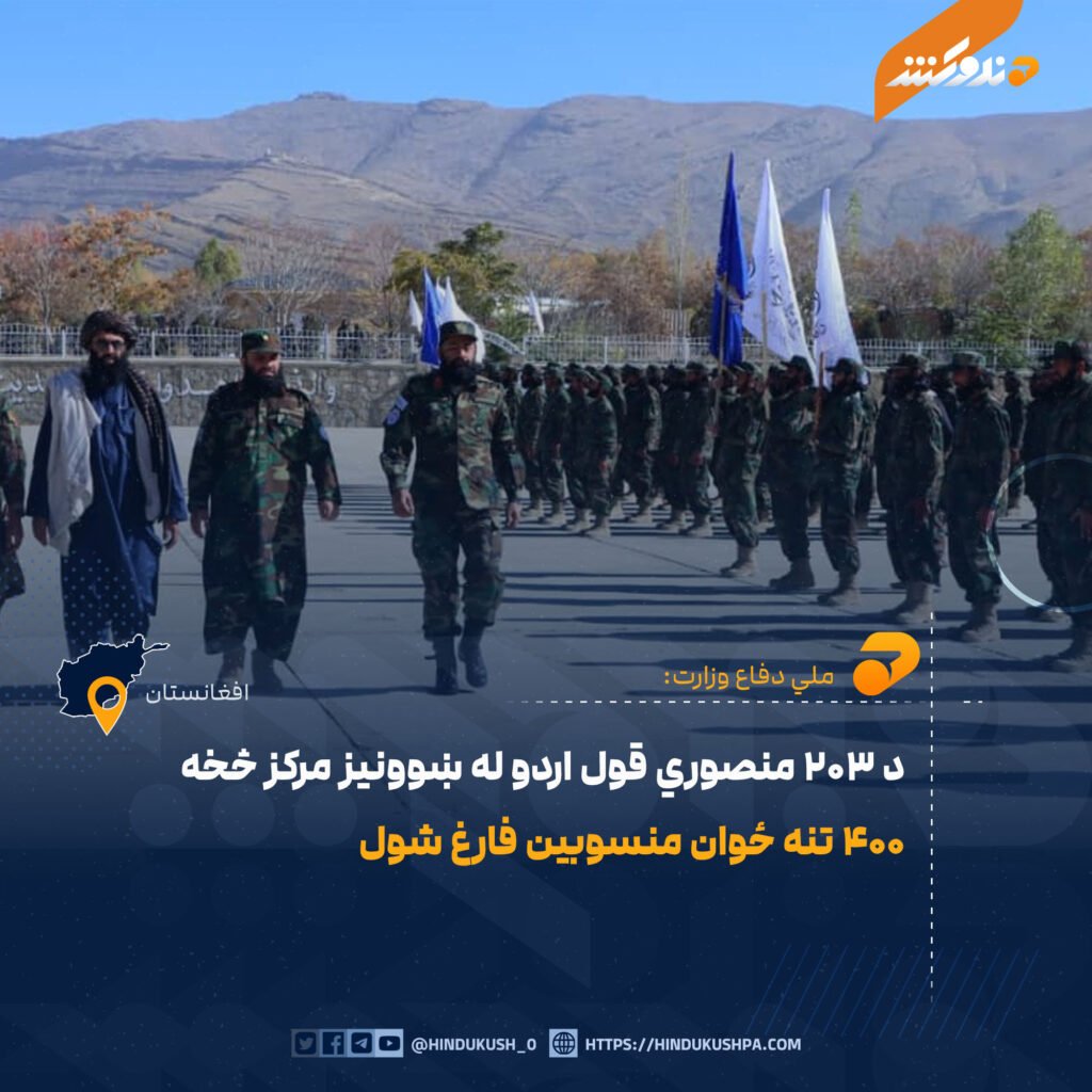 د ملي دفاع وزارت وایي، چې د دې وزارت اړوند ۲۰۳ منصوري قول اردو له ښوونیز مرکز څخه ۴۰۰ تنه ځوان منسوبین له درې میاشتني پوځي او عقیدوي زده کړو څخه فارغ شول.