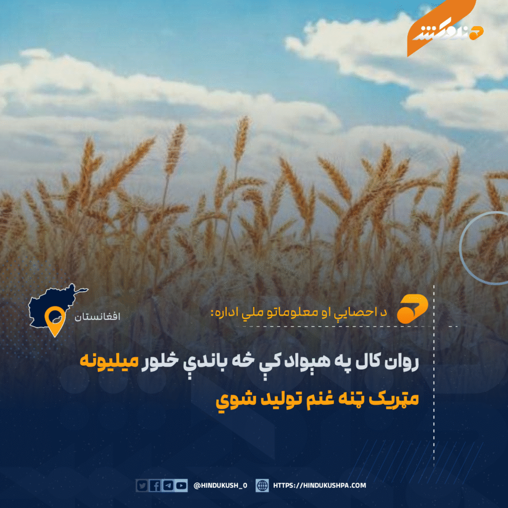 د احصایې او معلوماتو ملي اداره وایي، روان ۱۴۰۴ ه.ش کال په ټول هېواد کې شاوخوا ۴.۵۴ میلیونه مټریک ټنه غنم تولید شوي.