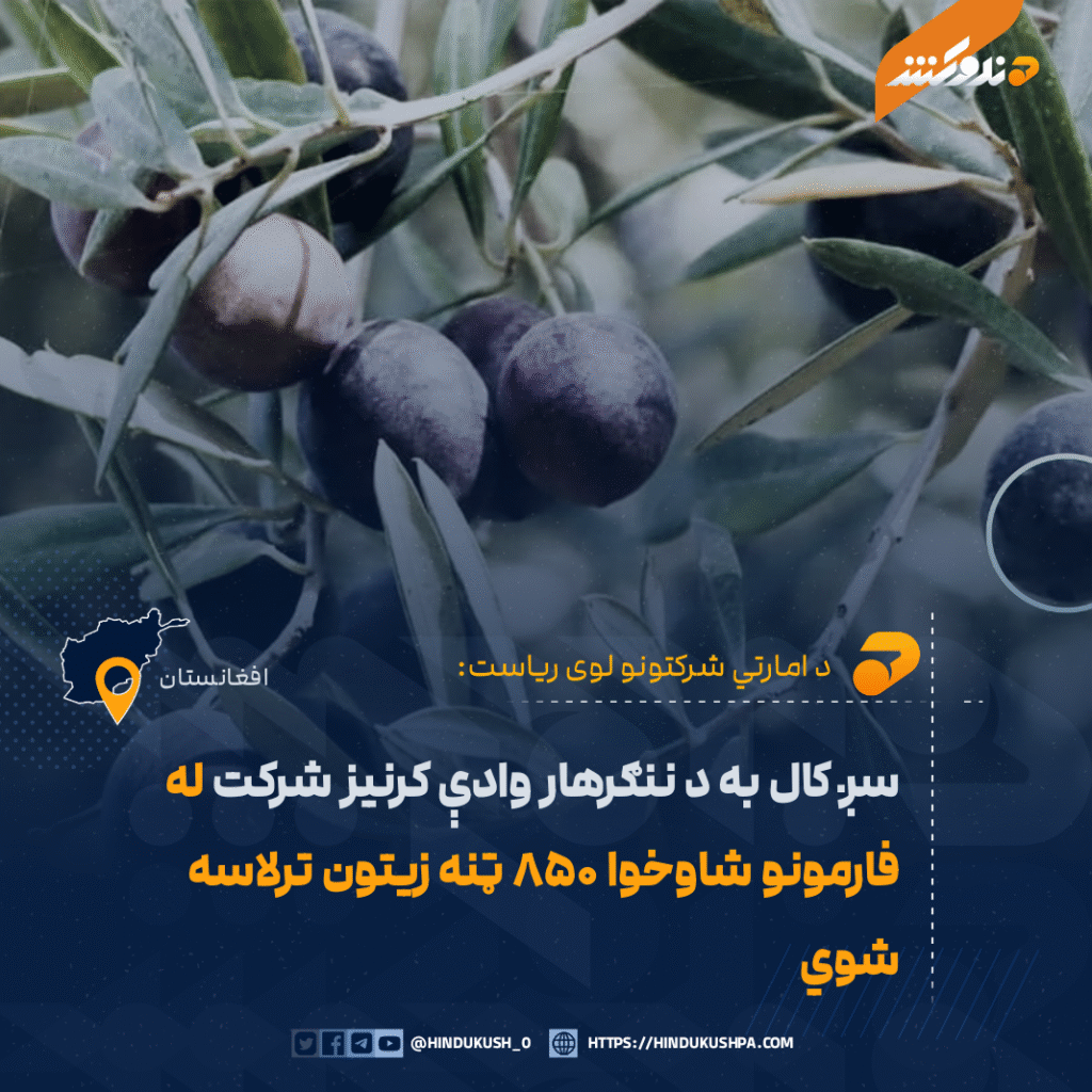 د امارتي شرکتونو لوی ریاست وایي، سږ کال به د ننګرهار وادې کرنیز شرکت له فارمونو شاوخوا ۸۵۰ ټنه زیتون ترلاسه شي.