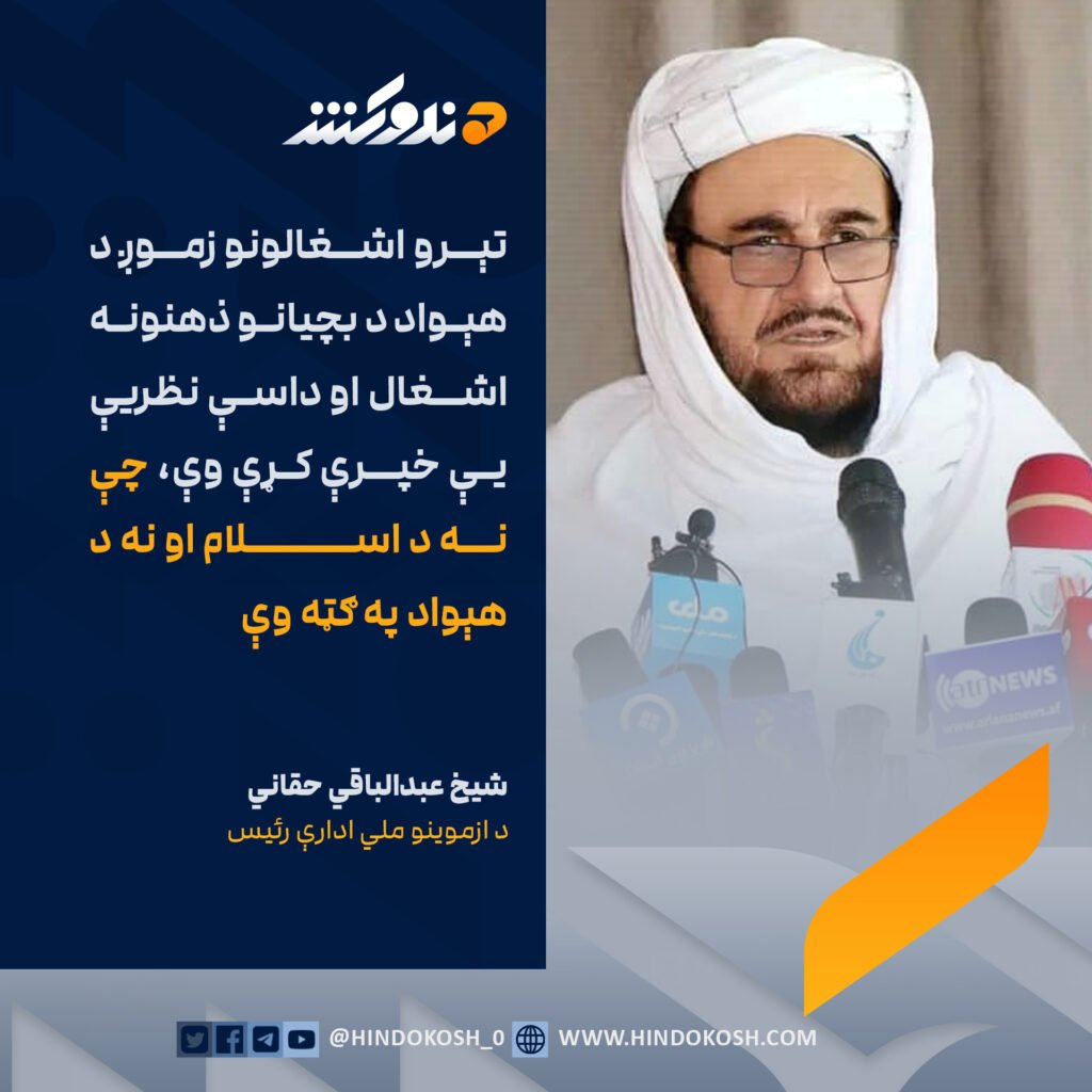 د ازموینو ملي ادارې رئیس شیخ عبدالباقي حقاني نن پنجشنبه (کب ۳۰مه) کابل کې د نوي ښوونیز کال د پیل مراسمو کې ویلي، چې هېواد کې تېرو اشغالونو زموږ د هېواد د بچیانو ذهنونه اشغال کړي وو او تېرو حکومتونو داسې نظریې خپرې کړې وې چې نه د اسلام او نه د هېواد په ګټه وې.