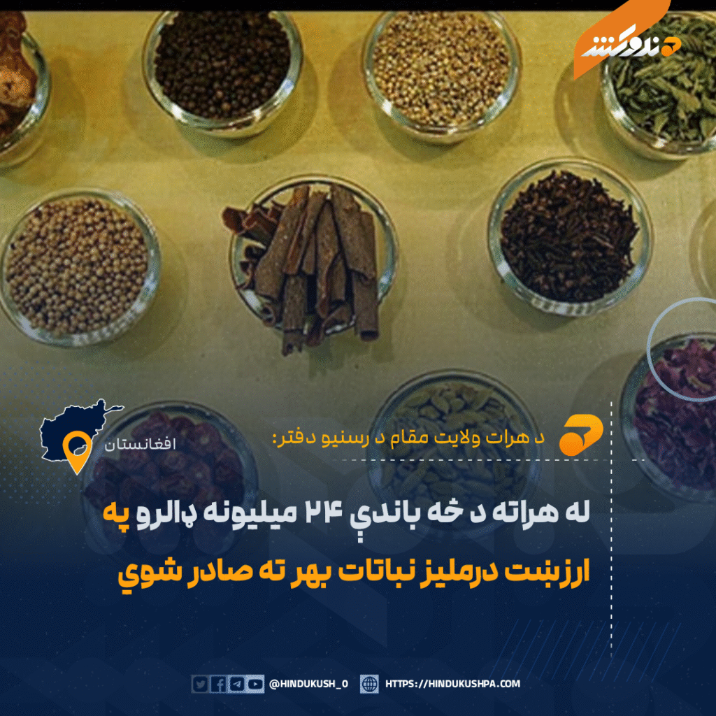 د هرات ولایت مقام د رسنیو دفتر ویلي، چې د روان ۱۴۰۴ لمریز کال په لومړیو نهو میاشتو کې د دې ولایت له لارې د ۲۴ میلیونه او ۲۶۸ زره امریکایي ډالرو په ارزښت درملیز نباتات بهرنیو هېوادونو ته صادر شوي دي.