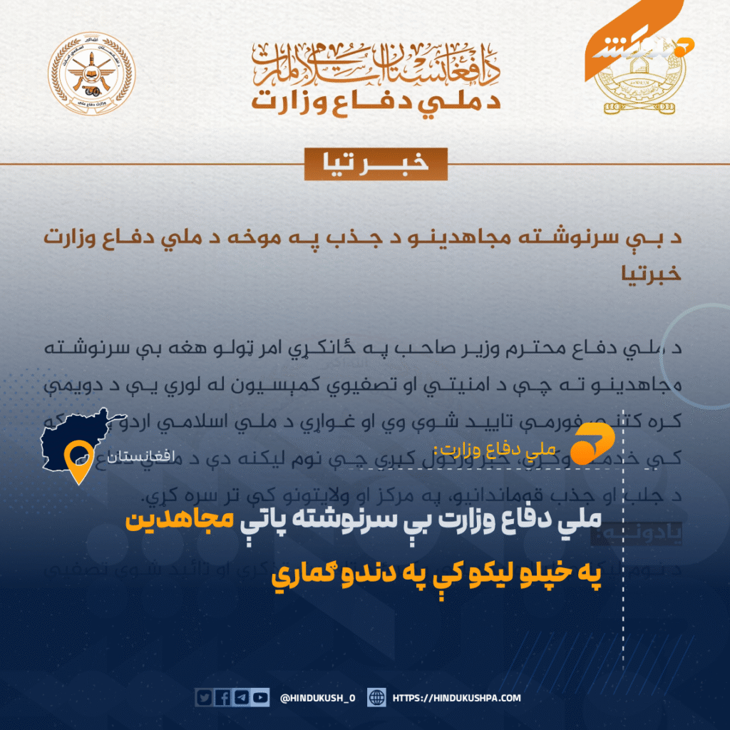 ملي دفاع وزارت د يوې خبرپاڼې په خپرولو سره وايي، چې د دې وزارت د وزير په ځانګړي امر هغه بې سرنوشته مجاهدين بيا په دندو ګماري، چې د امنيتي او تصفيوي کميسيون له لوري یې د دویمې کره کتنې فورمې تاييد شوې وي.