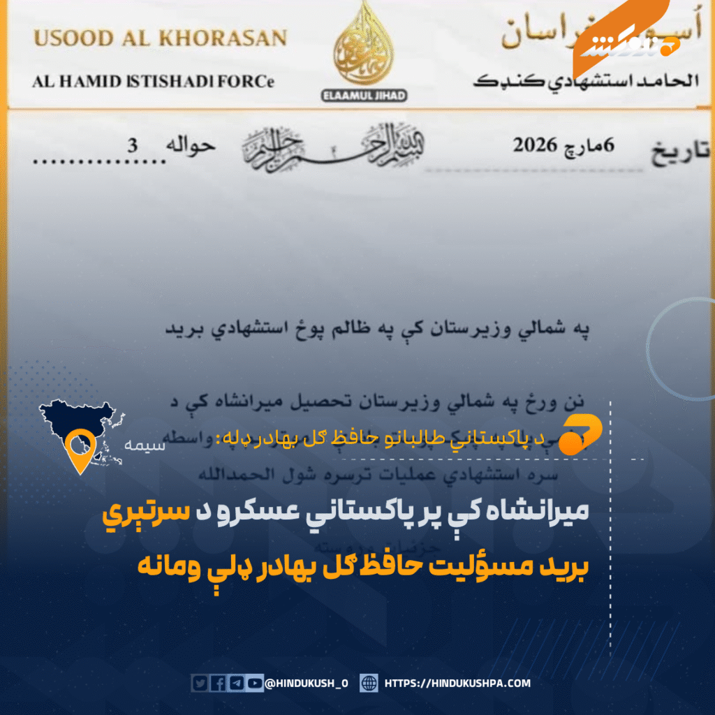 د پاکستاني طالبانو حافظ ګل بهادر ډلې د یوې اعلامیې په خپرولو سره د شمالي وزیرستان په میرانشاه سیمه کې د پاکستاني رژیم پر عسکرو د ترسره شوي سرتېري برید مسئولیت ومانه.