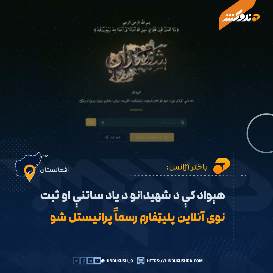 باختر خبري آژانس رئیس وايي، چې د هېواد د شهيدانو د قربانيو او تاريخ د منظم خوندي ساتلو په موخه یې له څو میاشتو پرلهپسې هڅو او کار وروسته د شهيدانو د ثبت انلاين پليټفارم پرانیسته.