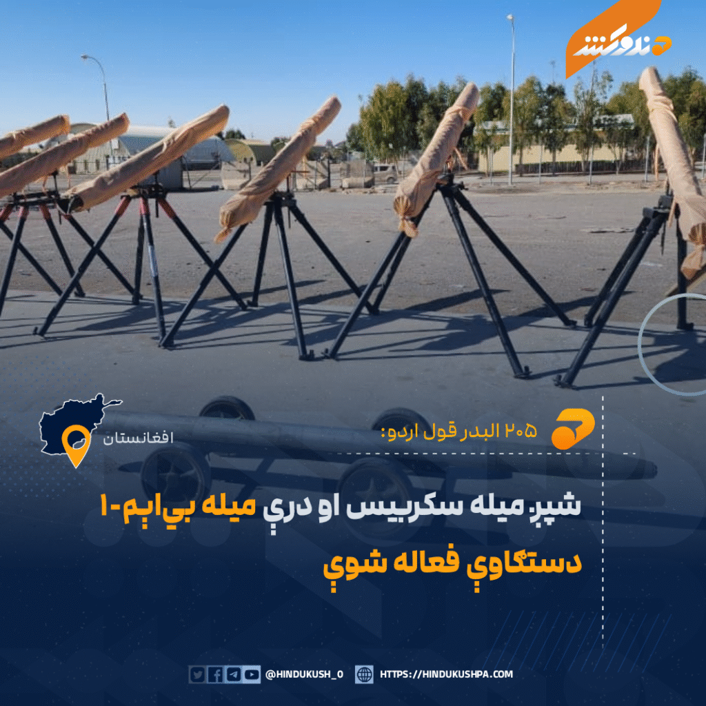 شېر کړئ Facebook Twitter بریښنالیک Telegram WhatsApp د ۲۰۵ البدر قول اردو مطبوعاتي دفتر ویلي، چې د دې قول اردو اړوند د پنځمې سرحدي لواء د توپچي آمريت له لوري شپږ سکربیس یو میله او درې میله بياېم-۱ دستګاوې فعاله شوې.سرچینې زیاته کړې، چې تر دې وړاندې هم د یادې لواء منسوبینو ورته دستګاوې ترمیم او فعاله کړې دي.